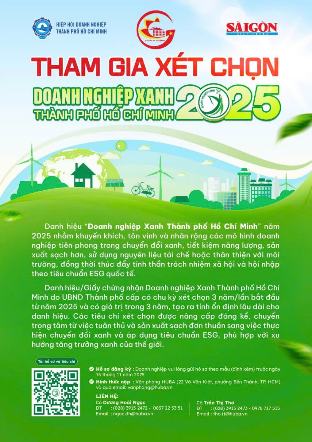 Thực hiện chỉ đạo của UBND TP.HCM, Hiệp hội Doanh nghiệp TP.HCM (HUBA) chủ trì tổ chức Chương trình xét chọn và tôn vinh Danh hiệu “Doanh nghiệp Xanh TP. Hồ Chí Minh” năm 2025, với mục tiêu:
